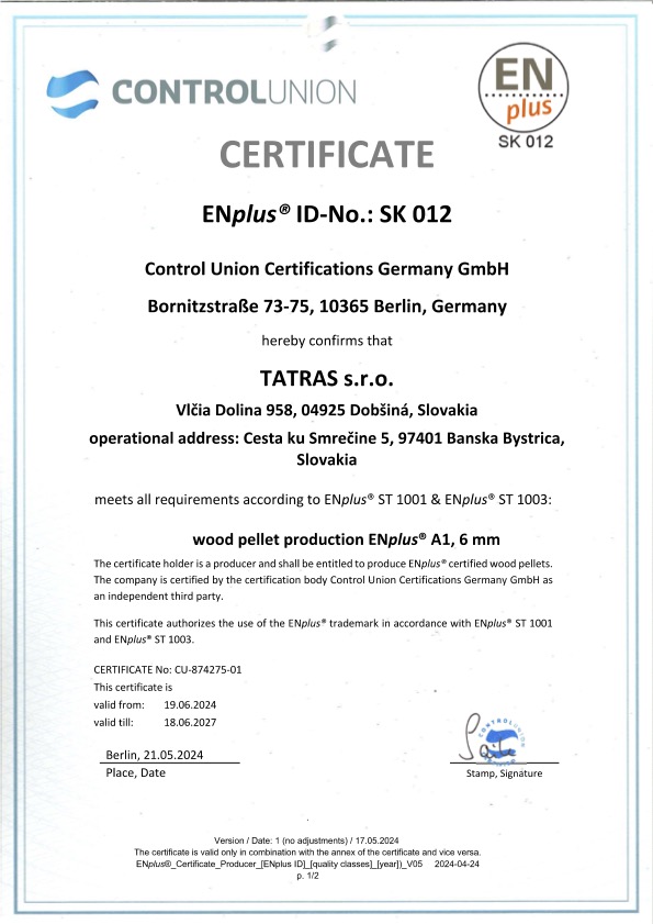 Spoločnosť TATRAS s.r.o. je držiteľom certifikátu ENplus® A1